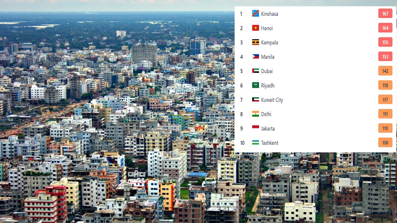 আইকিউএয়ারের দেওয়া তথ্যে দেখা যায়, দূষিত বায়ুর শহরের তালিকায় আজ শীর্ষে রয়েছে ডেমোক্রেটিক রিপাবলিক অব কঙ্গোর কিনশাসা শহর। সেখানের বায়ুর স্কোর ১৬৭। তালিকায় দ্বিতীয় স্থানে রয়েছে ভিয়েতনামের রাজধানী হ্যানয় স্কোর ১৬৪)। ১৫৫ স্কোর নিয়ে তৃতীয় অবস্থানে রয়েছে উগান্ডার রাজধানী কামপালা। চতুর্থ স্থানে রয়েছে ফিলিপাইনের রাজধানী ম্যানিলা, স্কোর ১৫৩।