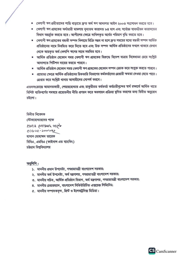 স্মারকলিপির অনুলিপি প্রধান উপদেষ্টা, অর্থ উপদেষ্টা, আর্থিক প্রতিষ্ঠান বিভাগের সচিব এবং বিএসইসি-র চেয়ারম্যান বরাবরও পাঠানো হয়েছে।